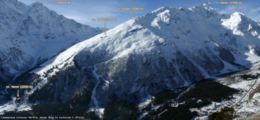 Высота Чегета чуть меньше 3700 м, максимальная высота подъема – 3050 м. Перепад высот достигает 1140 м. На горе круглый год дуют западные ветры, под их влиянием на склонах образуются снежные карнизы и уступы, их любят фотографировать лыжники. При своей популярности у туристов Чегет – лавиноопасная гора, большие снежные потоки сходят здесь зимой во время оттепелей.