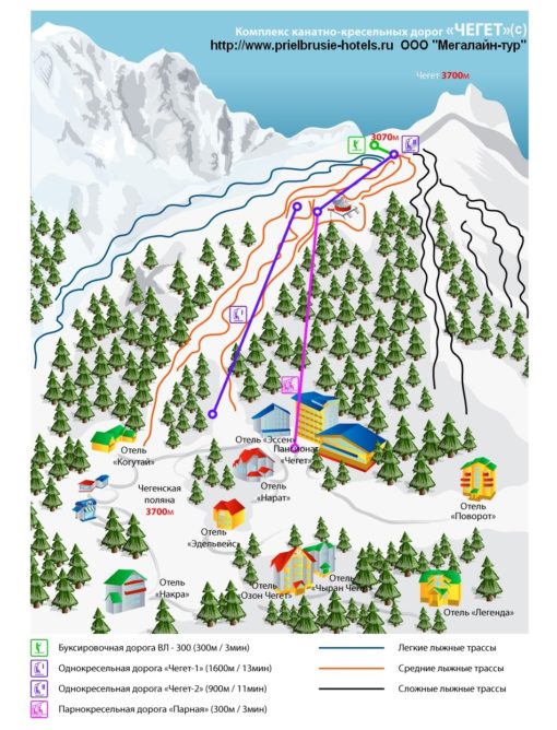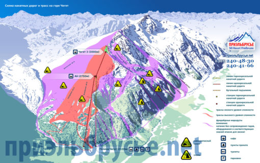 Особенность легальных трасс Чегета (всего их 15) — в недоступности для ратраков, поэтому на них быстро образуются бугры и ямы, спускаться по которым могут только опытные горнолыжники. Вообще считается, что эта гора не подходит для сноубордистов, большинство трасс узкие и слишком крутые для борда. Начинающим лыжникам на склонах Чегета тоже делать нечего, неопытные спортсмены часто травмируются сами и подвергают опасности окружающих. Впрочем, сложные трассы никак не мешают высокой посещаемости курорта. Очереди на подъемники в сезон (он длится с ноября по май) на Чегете – обычное дело.