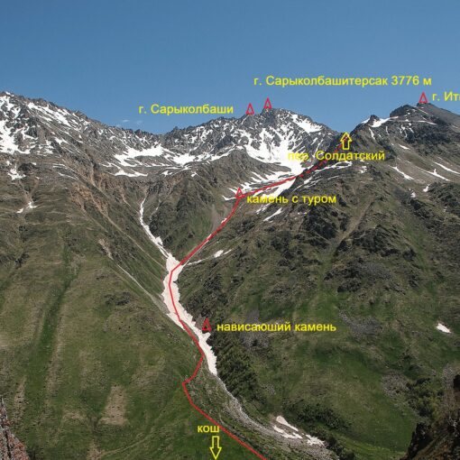 До начала маршрута из села Терскол от мечети идёт дорога. Через 45-50 минут ходового времени находится кош. Далее по тропе, вверх по ущелью через 40-45 минут ходового времени, справа ( орографически слева ) начинается ярко выраженная береговая морена, на которую ведёт тропа. Далее движение по морене до большого осыпного кулуара. Движение по кулуару вначале по правой стороне по ходу движения, затем по левой. Не доходя до чёрной скалы тропа поворачивает на крутой травянистый склон. Далее по склону, переходящему в осыпь по тропе маркированной турами выход на ригель. От начала морены 60-70 минут ходового времени.