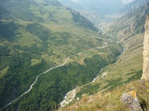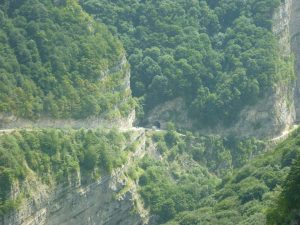 Одним словом, возвращаться мы решили прежним путем. Внизу перед нами лежало Черекское ущель. Вид открывался поразительный. Впереди – Верхняя Балкария, позади – Кашхатау, внизу лента шоссе с движущимися машинами, столь малыми при виде сверху, что ноготь на пальце прикрывал всю машину.