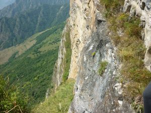 Площадка же на какую мы вышли составляет метров семь, не больше. И дальше обрывается в пропасть. Именно в пропасть. Но именно к площадке проложэена по скале с лежащего ниже карниза деревянная лестница. Что она из себя представляет? Рассказываю со слов пастуха, так как лестницу сверху невозможно сфотографировать. Она уходит отвесно вниз и для того, чтобы захватить ее в объектив, надо вытянуть над пропасть не только голову, но и часть туловища. Перспектива прямо скажу не из приятных. Но с другого места лестницу не видно.