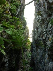 Лестница над пропастью сохранилась. Я горел желанием спуститься по ней, но меня отговорили пастухи, которые сейчас держат на плато скот. Но до самой лестницы мы добрались. Спустились на метров восемь с самого плато по природной трещине. Она настолько узкая, что приходится двигаться боком, а на ряде участков протискиваться иежду скалами. Причем все время надо держаться за каменные выступы, так как угол спуска приближается к 50 градусам. Ну уж если быть точнее – он составляет 47 градусов. Причем никаких ступенек в трещине нет, а в одном месте надо даже спрыгивать, так как спуск продолжается более чем через полметра.