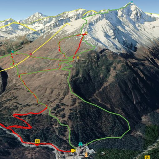 Нитка маршрута: Калинов мост (2520м, 1км), поляна Эммануэля (2560м, 1км), немецкий аэродром (2870м, 2км), каменные грибы (3221м, 4км), северный приют (3200м, 4км).