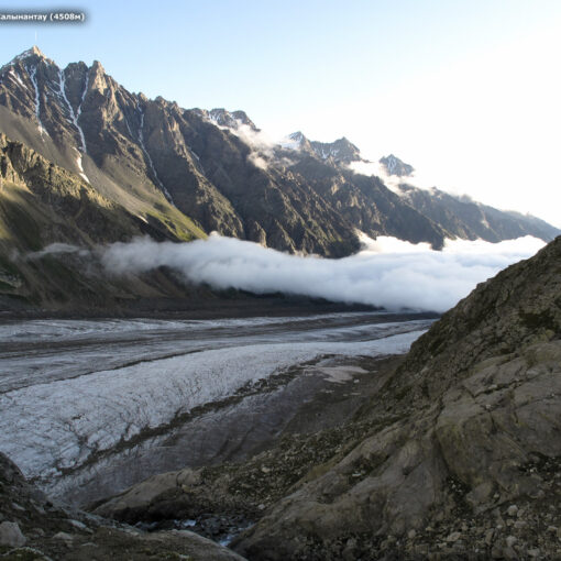 По средней осыпи и травянистым склонам правого борта долины движемся влево-вверх, оставляем конечную морену ледника справа по ходу и по правобережной морене выходим на ледник Юж. Сабалык. Ледник ровный, открытый, но в нижней и средней части покрыт панцирной мореной, уклон 5 — 10 градусов. На моренах бивак, вода на леднике, площадки необходимо ровнять. От реки Адырсу 10 — 11 часов.