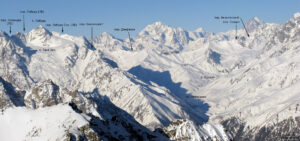По центру — Шхара, правее, вдали пирамида Гестолы. А слева — очень красивая вершина Айлама (16-е место по высоте, однажды очередь дойдет и до нее…).