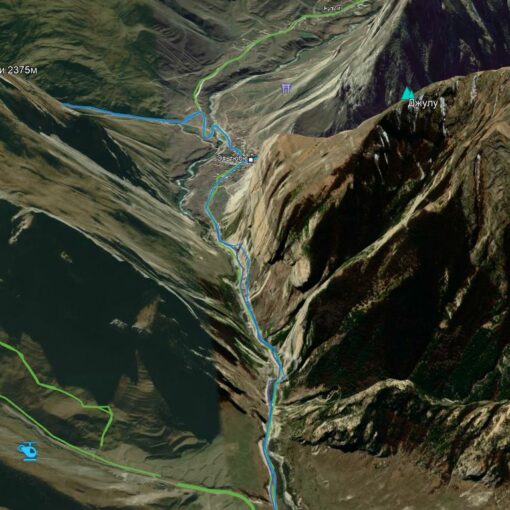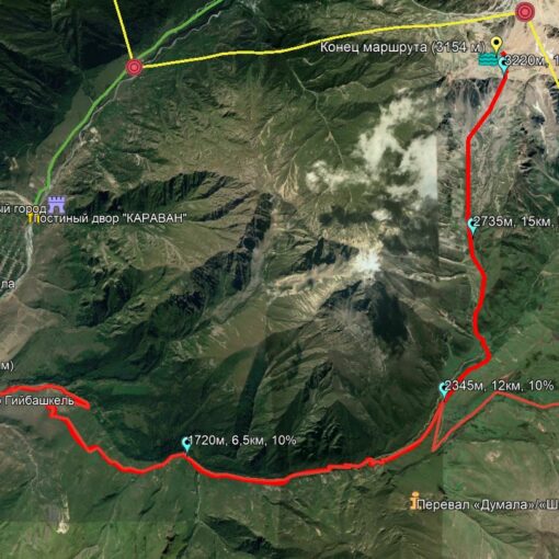Нитка маршрута а.л.Уллутау (2345м) — нижние кичкидарские ночевки (2945м, 3км) — Живое(изумрудное)/мертвое озеро (3245м, 6км)