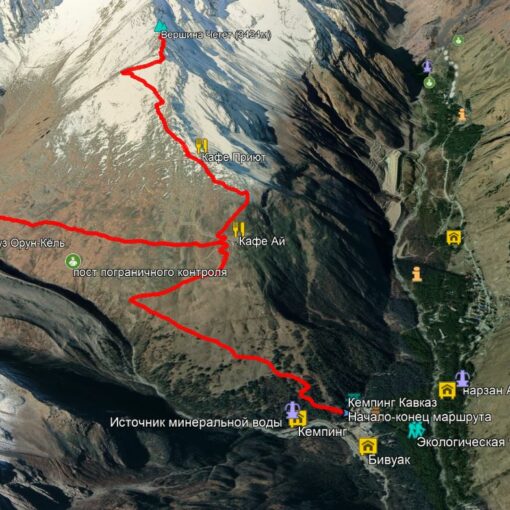 Нитка маршрута: кемпинг (2000м) — озеро Донгуз Орун (2550м, 3км) — кемпинг (2000м, 3км) — г.Нальчик (114км)