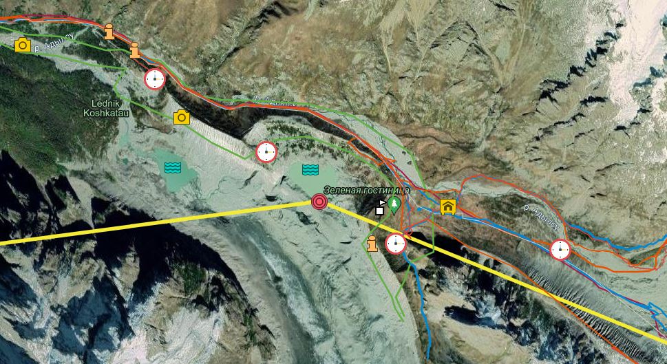 - Слияние троп (76489) на правом берегу истока р. ЧЕРЕК БЕЗЕНГИЙСКИЙ (точка № 20 с координатами 43°06’44» северной широты, 43°08’39» восточной долготы) в 400 м западнее альплагеря БЕЗЕНГИ (76487), с июня по октябрь в светлое время суток.