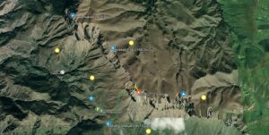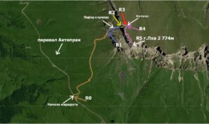 Перечень географических точек следования по маршруту: перевал Актопрак (1950м.н.у.м. 43.39874, 43.09631) — Перевал Лха (2450м, 3,5км 43.42311, 43.09943) – вершина г.Лха (2774 м, 2км 43.40781, 43.10997).