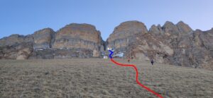 Участок R0-R1: 1,8 км от дороги с перевала Актопрак (1933м, 43.39899, 43.09603) к подход к кулуару (2390м 43.40958, 43.10381). Участок от перевала 0,6км можно проехать на внедорожнике при низкой влажности и осадков.