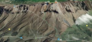 Участок R1-R2: 0,4 км подход к кулуару (2390м 43.40958, 43.10381) до входа в кулуар (2630м, 43.41031, 43.107). Участок проходит по крутому травянистому склону, местами до 40 ºС. Участок сложен из-за крутизны как на подъем, так и на спуск. При наличии влажностости скользко.
