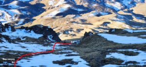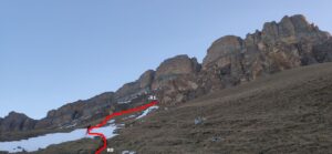 На протяжении 500-600 метров проходятся траверсом небольшие осыпные кулуары через 2,2 км от начала маршрута с перевала Актопрак.