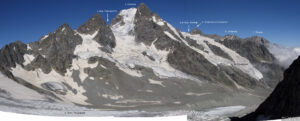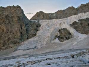 История ледника: 1986 г. → 2.50 км², 2004 г. → 1.72 км², 2014 г. → 2.13 км²