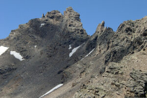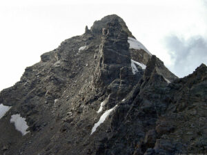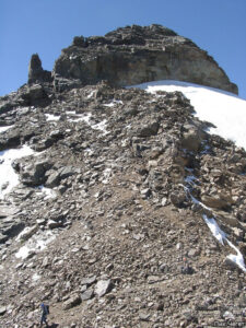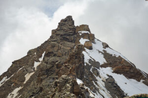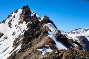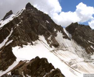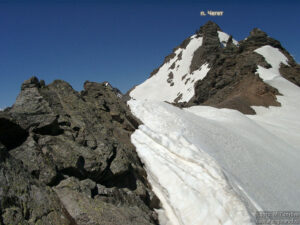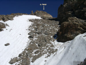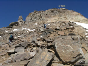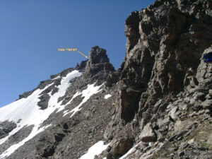 По правой или левой стороне кулуара (по кулуару идут камнепады!) подъем на осыпь, откуда виден Больщой жандарм Восточного гребня и за ним слева маленькая вершина. Отсюда по некрутым осыпям, чередующимся с небольшими снежниками, подъем на седловину Восточного гребня между Большим Жандармом справа и вершиной слева. От морены 1,5 часа.