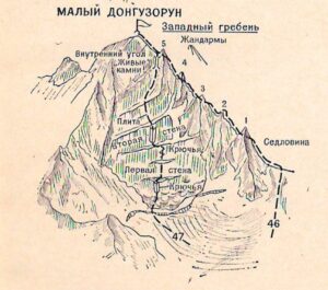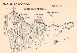 С седловины подниматься по крутой осыпи широкого гребня до скального взлета вершины. Из-под взлета траверс влево по желтой скальной полке до плиты. По плите (страховка!) вверх-вправо на гребень взлета. Далее по простым скалам пологого гребня на вершину Малый Донгузорун. От седловины 20 — 30 минут.