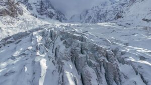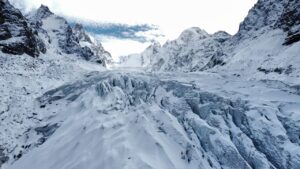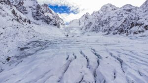 Расположенный на высоте 4 000 метров, этот долинный ледник питается не столько снегом, сколько лавинами и обвалами — мощными, неумолимыми. А талая вода, превращаясь в ручьи, устремляется вниз, оживляя горные склоны 💧.