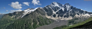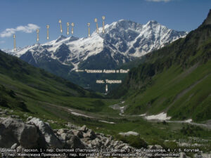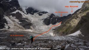 От поляны Чегет проходим по грунтовой дороге по орогр. левому берегу р. Донгуз-Орун до места, где река разливается на два рукава, через которые преброшены мостики из нескольких бревен. Если мост смыт, нужно идти по берегу вниз по течению до завала из деревьев, через который тоже можно перейти реку. За мостиками — хорошая тропа, которая через 1,5 часа пути по сосновому, а затем березовому лесу выводит на альпийские луга, очень красивое мето, т.н. «стоянки Адама и Евы» — кругом пышное разнотравье, прозрачные ручьи, водопады, снежники и зеленовато-голубоватый язык ледника Когутай (фото 2).
