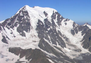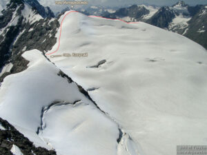 Идем по направлению к леднику еще 20 минут, затем поднимаемся на гребень левобережной морены, поднимаемся немного по нему и траверсируем до гребня, ведущего на вершину (фото 3). От языка ледника — 30 минут.