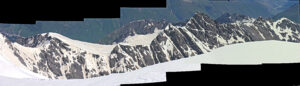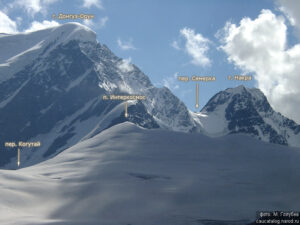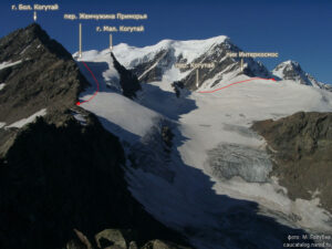 В начале гребень простой, разрушенный, в основном из крупных глыб. За 20-30 минут подходим к небольшому крутому снежному взлету (20 м, 45 град.) перед сложным участком гребня, который лучше обойти слева по ходу. По снежнику немного левее по ходу от гребня выходим на короткий участкок средней осыпи, за которым траверсируем склон по снегу (80 м, 35-40 град). Обойдя скальный взлет в гребне, по крутому снежному склону (50 м, до 45 град.) возвращаемся на гребень. Отсюда и до вершины он снежный, пологий с короткими крутыми снежными взлетами, которые можно пройти в лоб или обойти по скалам там, где это проще. Выше скального взлета, который мы обошли, регулярно встречаются площадки для палаток. Есть одна площадка и до взлета. В районе вершины и на пер. Когутай также есть площадки. Путь от выхода (первого, от ледника) на гребень до вершины занимает 2,5-3,5 часа. Общее время подъема на вершину от поляны Чегет — 5-6 часов.