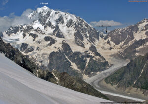 3. Справа вершина Шхара, а в горном цирке под ее склонами — мощное оледенение с умопомрачительными трещинами.