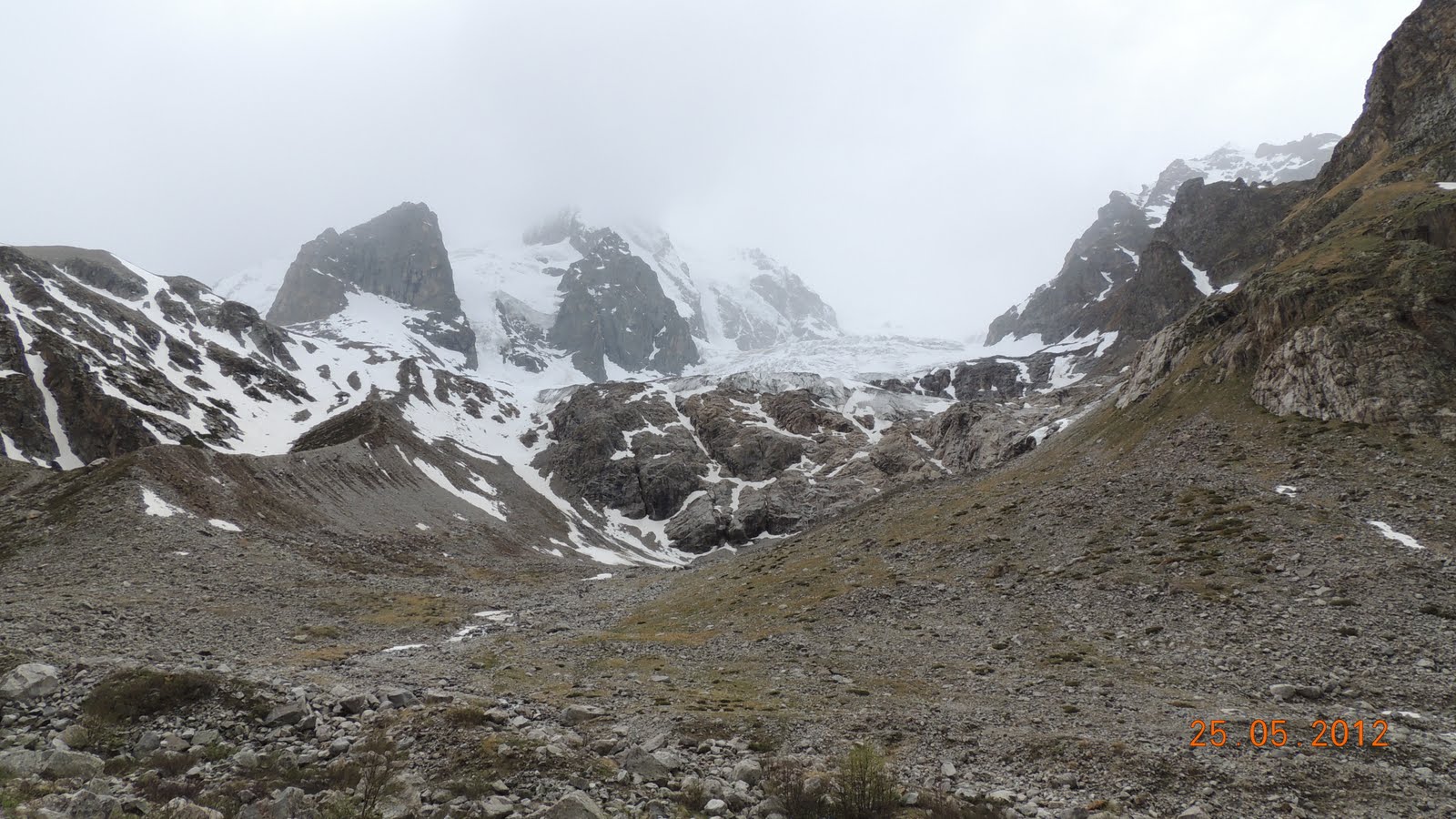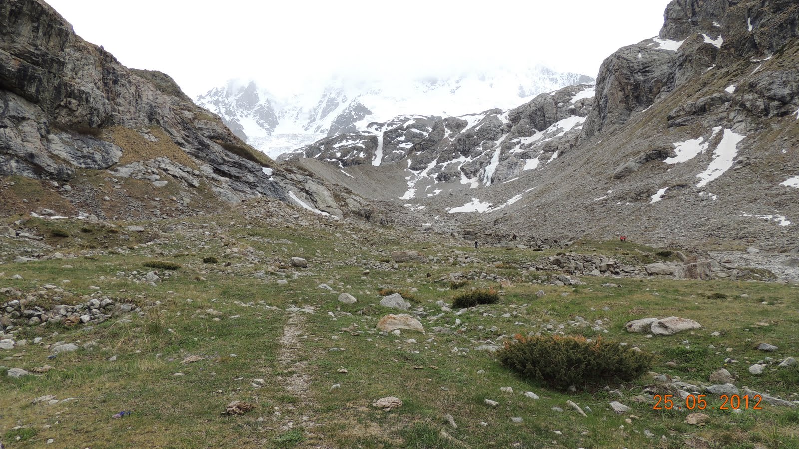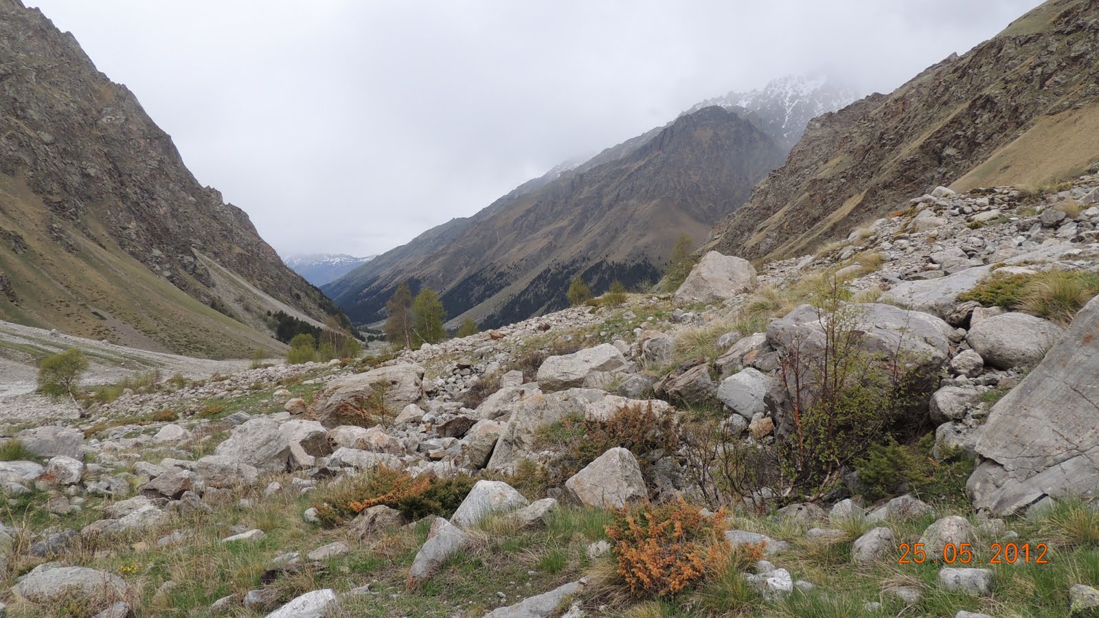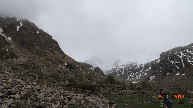 Доехали до альплагеря и далее двинули пешком.   Климат здесь несколько отличается от района Терскола, Чегета и Азау, расположенного в том же регионе и на той же высоте. Так в Адыр-су преобладает менее ветреная погода, но из-за того, что теплые массы с равнины напрямую не поступают в ущелье, чуть более холодная. Именно поэтому снег даже на высоте альпбазы «Уллу-тау» лежит до середины мая