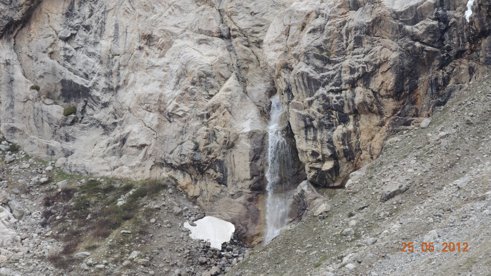 Водопад. Что любопытно,визуально кажется что до него метров 700-800, не более. На самом деле с места съёмки до него четыре с половиной километра. В горах на глазомер лучше не надеяться.