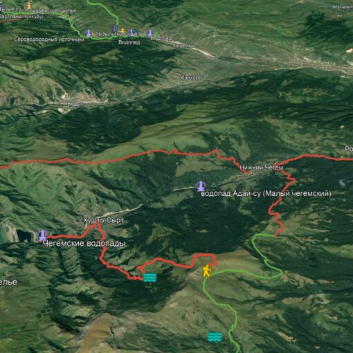 Нитка маршрута: кемпинг, поляна Чегет, водопад Тескол, кемпинг.