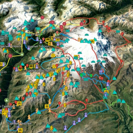 Контрольные точки: родник у кемпинга, обзор ледника 7ка, озеро Донгуз Орун, обзор ледник 7ка.