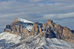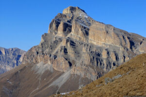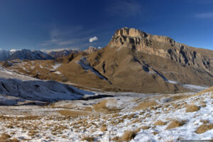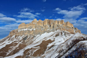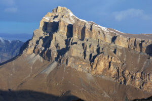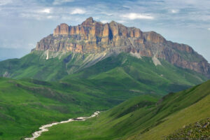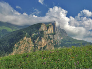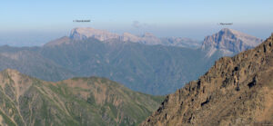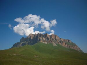 Это очень красивая гора в Скалистом хребте, высотой 3154 метра, расположена между Черекским и Суканским ущельями. Впрочем, вершина подробно описана в проекте «100 вершин Кавказа» на соответствующей странице. Однако, на саму вершину я до сих пор не поднимался. В этот раз это упущение было исправлено. Поднялись мы с одной ночевкой, с севера, от Верхних Голубых озёр. С этой стороны склоны пологие, нет таких стен, как с юга. Без промежуточной ночевки я бы не рекомендовал ходить — общий набор высоты почти 2 км: даже если стартовать рано утром, на вершине будешь не ранее середины дня, когда погода, как правило, портится, как минимум налетают облака. Мы ночевали с принесенной с собой водой, а таскать ее довольно тяжело. Так что лучше заночевать поближе к вершине у открытого нами родничка (см. отчет).