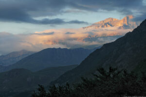 10. Закатные силуэты вершин Скалистого хребта Соухаузкая, Иткаябаши, Каракая.