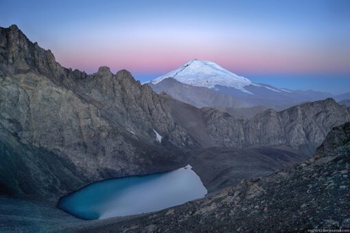 Начало похода совпадает с маршрутом № 2. Ночевать лучше всего на приюте «Новый кругозор» (2900 м) или в палатках возле него, чтобы полюбоваться вечерней панорамой гор. В розовых лучах заката особенно эффектны в боковом (западном) освещении вершины Главного Кавказского Хребта. Если к тому же Баксанская долина заполнена облаками, то возникает неповторимое ощущение, будто вы находитесь на обрывистом берегу седого пенящегося моря.