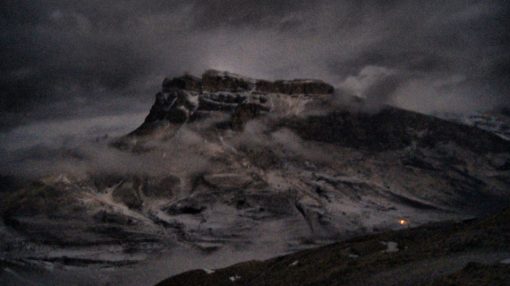 С места ночевки открывается вид на верховья долины со снежным конусом Эльбруса. В противоположной стороне — живописные скалы с черными провалами пещер.