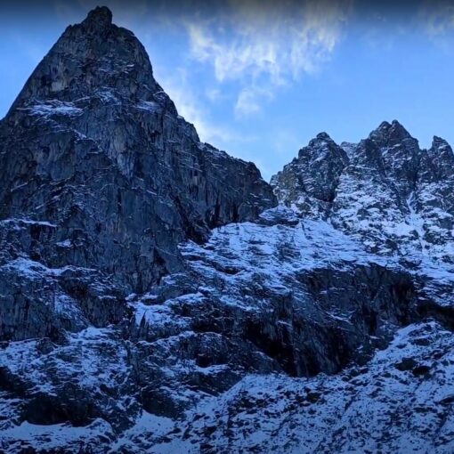 37. Моя палатка и закатный Тихтенген. Над вершиной Китлод луна.